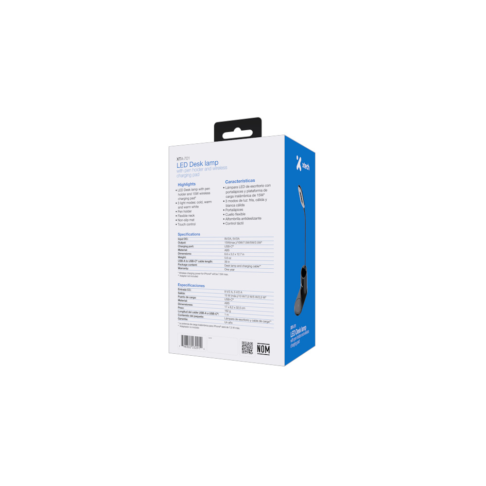 La Xtech XTA-701 es una lámpara de escritorio versátil diseñada para optimizar espacios de estudio o trabajo. Cuenta con un cuello flexible que permite orientar la luz según la necesidad y ofrece tres modos de iluminación ajustables (fría, cálida y blanca cálida) mediante controles táctiles. Su base integra una plataforma de carga inalámbrica Qi de hasta 15W para teléfonos compatibles y un práctico portalápices para mantener el escritorio ordenado.