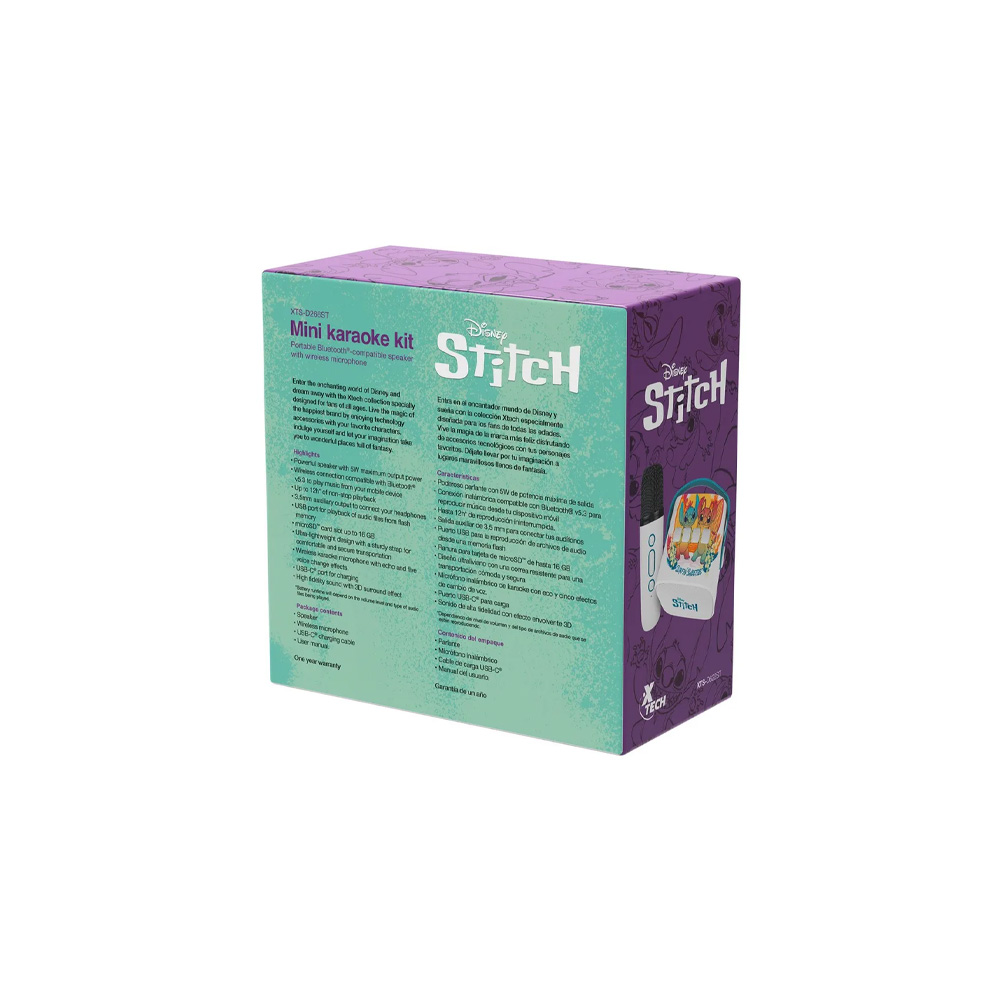 Convierte cualquier momento en una fiesta con el Mini Kit Karaoke Xtech XTS-D622ST, la edición especial de Disney Stitch. Este encantador altavoz portátil no solo es un dispositivo de audio, sino que también es un compañero perfecto para tus momentos de entretenimiento, ideal para niños y fans de Disney.