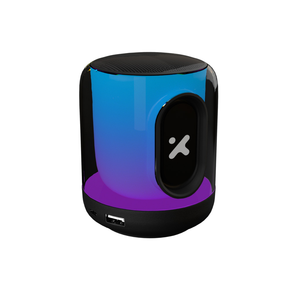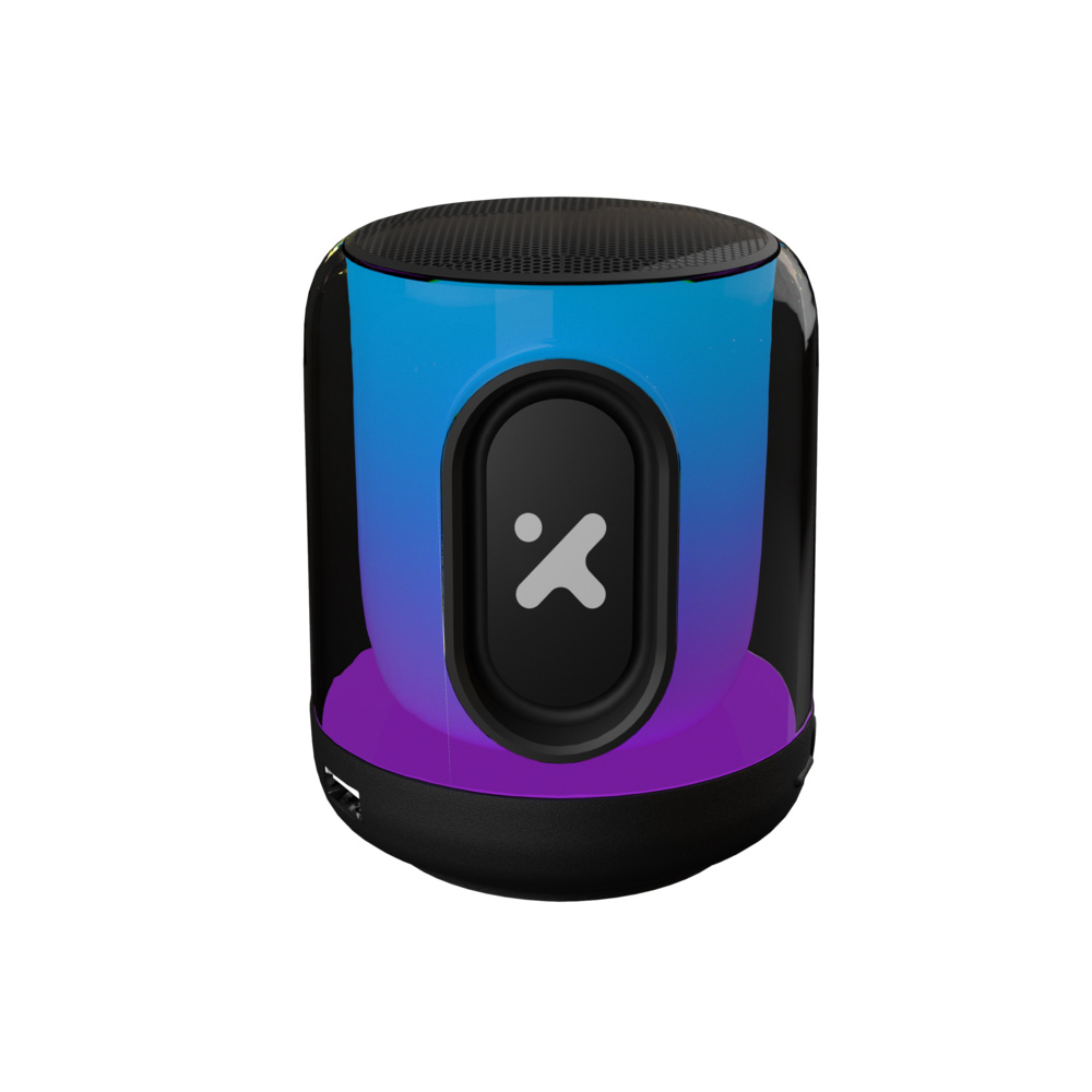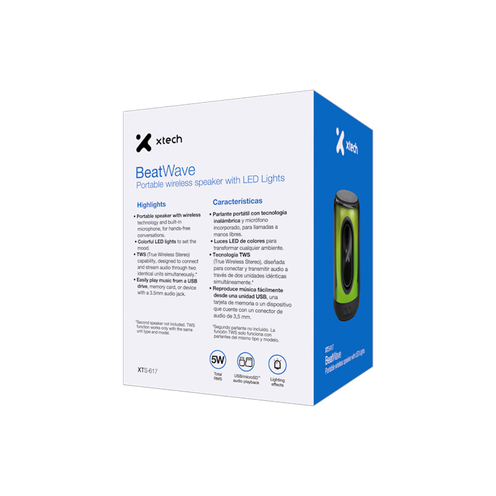 El Xtech BeatWave (XTS-617) es un parlante inalámbrico ultracompacto diseñado para llevar la música y el ambiente a cualquier lugar. Combina una potencia de 5W RMS con luces LED dinámicas que cambian de colores para transformar el entorno. Equipado con tecnología Bluetooth 5.3, ofrece una conexión estable y eficiente. Además, incluye la función TWS (True Wireless Stereo), permitiendo vincular dos unidades iguales para una experiencia de sonido estéreo más amplia. Es versátil en conectividad, permitiendo reproducir música desde memorias USB, tarjetas microSD y entradas auxiliares.