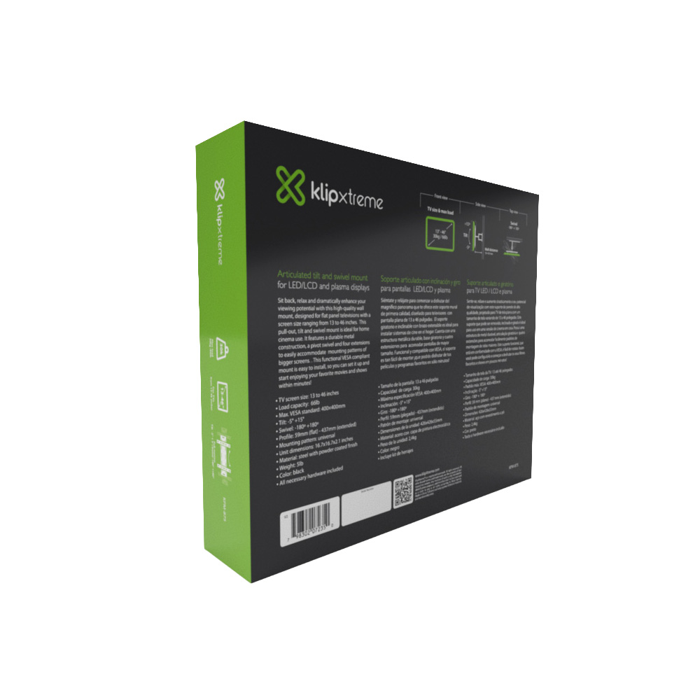 El Klip Xtreme KPM-875 es un soporte mural de primera calidad diseñado para televisores de pantalla plana y monitores de entre 13 y 46 pulgadas. Su diseño articulado con brazo extensible permite una flexibilidad total, permitiendo alejar la pantalla de la pared, girarla e inclinarla para obtener el ángulo de visión perfecto desde cualquier lugar de la habitación. Fabricado en acero resistente con un acabado de pintura electrostática, combina durabilidad con una estética moderna y discreta. Es ideal para instalaciones de cine en el hogar o espacios de trabajo donde se requiere movilidad y ahorro de espacio.